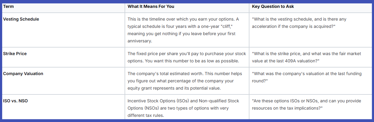 Your equity grant is only as valuable as the company's future success. Always ask about the company's current valuation, total shares outstanding, and funding stage to get a realistic sense of what your options could one day be worth.